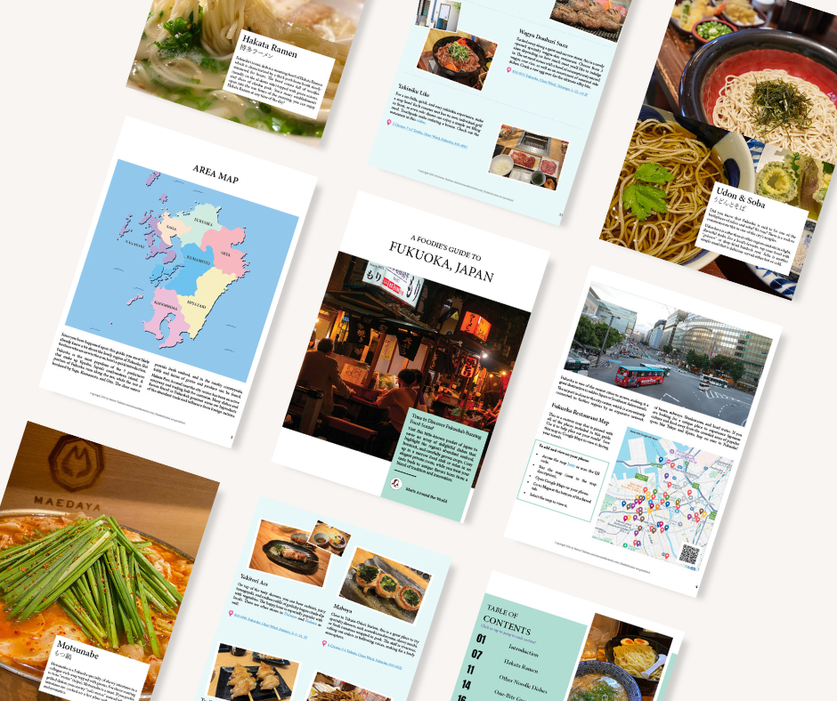 The 40+ pages are packed with pictures that might make you drool, as well as access to a custom Google Map with clickable location pins. Save the map to your Google account and use it to plan your next Fukuoka adventure! (Map access requires an internet connection.) A detailed list of over 50 restaurants in Fukuoka city and beyond. Tips on how to enjoy dining in Japan, an area overview, and insight into the region’s top dishes.